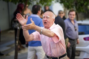 Nella foto: Un anziano annuncia l’arrivo del primo ministro Alexīs Tsipras