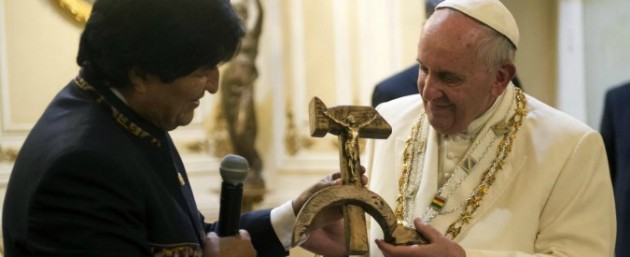 Papa Francesco in Bolivia contro la speculazione finanziaria. Evo Morales gli regala crocifisso su falce e martello