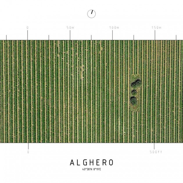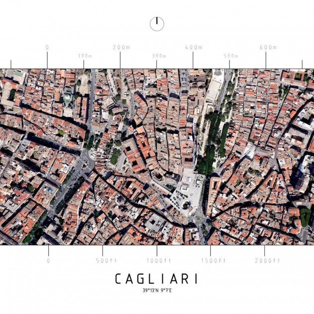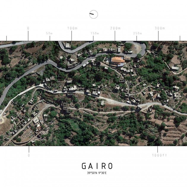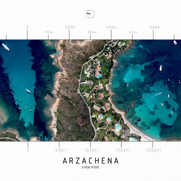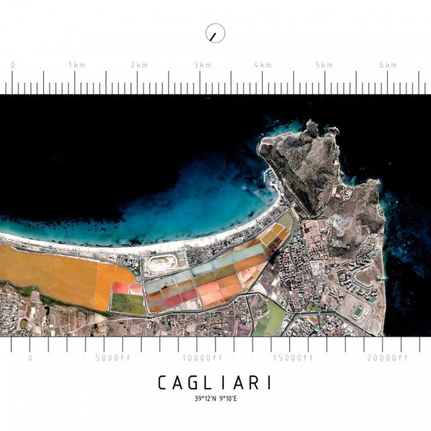 Sfogliando virtualmente le foto c’è tutto: la costa, ovviamente: quella frastagliata di Caprera con di fronte l’affollamento delle barche, lo scempio degli incendi in area protetta a Golfo Aranci, la speculazione edilizia delle mini villette a un tiro di schioppo dall’acqua in Gallura. C’è l’interno dell’Isola con la linea del Supramonte, il profilo e le geometrie dei più conosciuti siti nuragici – tra tutti Barumini, patrimonio dell’umanità, secondo l’Unesco – ma anche gli uliveti di Sassari con i profili interrotti dai piccoli depositi diventati case residenziali, i quartieri storici di Cagliari e ancora le vigne di Alghero. Per tutte le immagini, a colori, ci sono le coordinate satellitari e un link per l’inquadramento generale, oltre al nome del luogo: banda bianca sopra e sotto, stile minimalista.