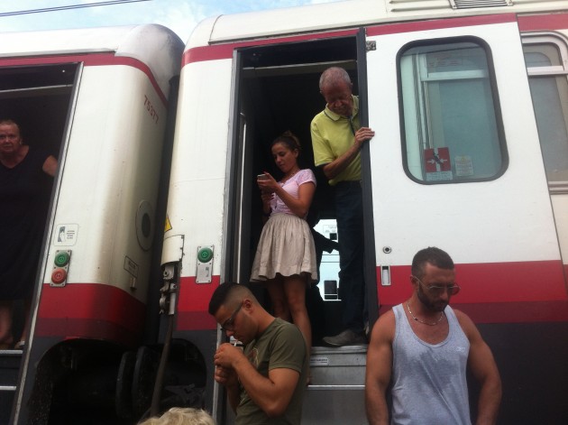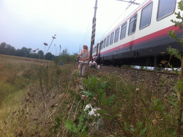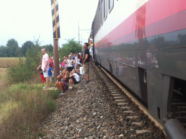 L’aria nel treno comincia a farsi irrespirabile. “Se non aprono le porte qui qualcuno comincerà a stare male”, dico al ragazzo del minibar. Ha addosso un pantalone lungo, la camicia e pure la cravatta. “Non possono aprire le porte”, dice sofferente mentre prova a gestire l’assalto dei viaggiatori, tutti in cerca d’acqua fresca. “Quando succedono queste cose di solito arrivano altre vetture e si fa il trasbordo”. Ma dopo mezzora di sofferenza, poco prima che il treno si trasformi in una serra, vengono aperte le porte lato campagna. Intanto partono, a pochi minuti di distanza uno dall’altro, due messaggi audio identici: “C’è un guasto, i tempi per la riparazione non sono quantificabili”. Poi più nulla. La gente comincia a scendere dal treno e si riversa nei campi.