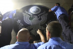 Workers place the seal of The United States of America on the wall at the main entrance of the U.S. embassy in Havana, August 14, 2015. U.S. Secretary of State John Kerry travels to Cuba on Friday to raise the U.S. flag at the recently restored American embassy in Havana, another symbolic step in the thawing of relations between the two Cold War-era foes. REUTERS/Enrique de la Osa