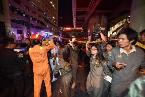 (150817) — BANGKOK, Aug. 17, 2015 (Xinhua) — Rescuers enter the site of an explosion in downtown Bangkok, capital of Thailand, on Aug. 17, 2015. At least 15 people were killed and more than 80 others injured in an explosion in downtown Bangkok on Monday night, according to local media. (Xinhua/Li Mangmang)