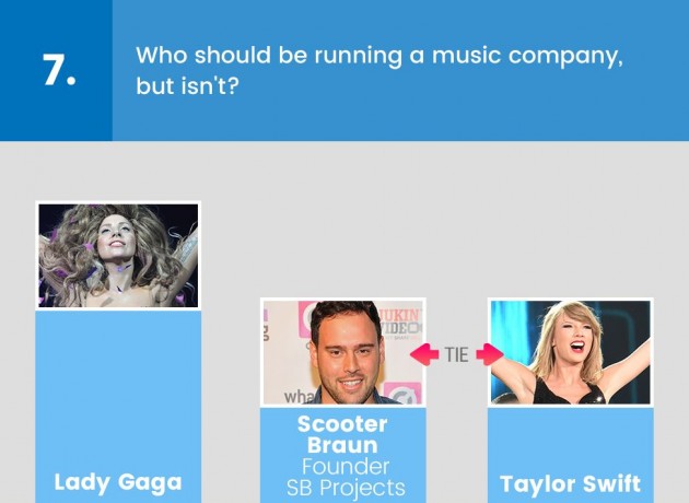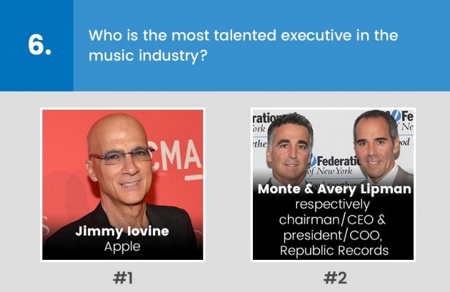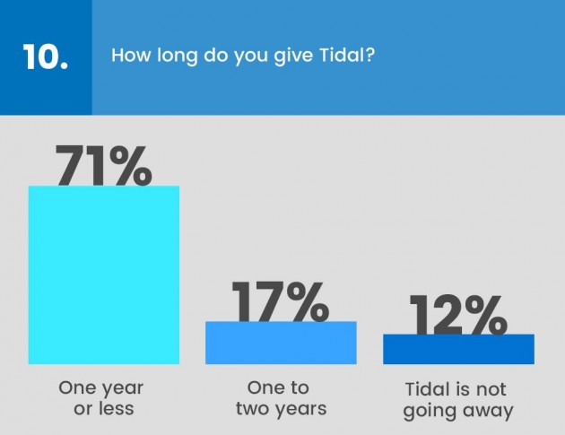 Particolarmente interessante anche la risposta a una domanda molto attuale: “Lascereste il vostro attuale lavoro per passare a Spotify o Apple Music?”. Ebbene, il 54% degli intervistati ha risposto affermativamente, a dimostrazione del fatto che la musica sta andando in quella direzione e i top manager della musica americana lo sanno alla perfezione. A proposito di streaming, pochissimi scommettono su Tidal, la creatura di Jay Z e di un gruppetto di grandi stelle della musica globale: il 71% degli intervistati dà al progetto un anno di vita, il 17% due al massimo e il 12% già adesso è certo che Tidal durerà a lungo.