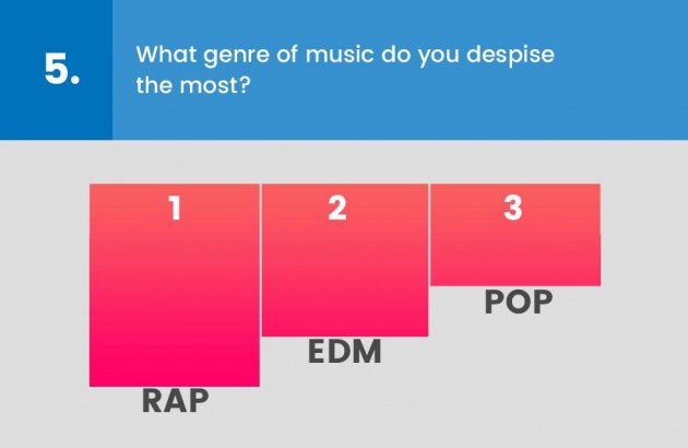 La domanda che dà il senso, invece, di una certa autocritica, seppur anonima, dell’industria musicale, riguarda il trattamento che le etichette riservano agli artisti: “Il mercato discografico è giusto con gli artisti?”. No, per il 58% degli intervistati. E c’è da crederci, visto che il mercato discografico sono loro. E ancora: “Qual è il genere che disprezzate maggiormente?”. Trionfa il rap, che negli Usa va ancora alla grande, e che anche dalle nostre parti è diventato assai di moda. A seguire, la dance elettronica e il pop. I discografici, insomma, odiano i generi musicali che più degli altri pagano i loro stipendi.