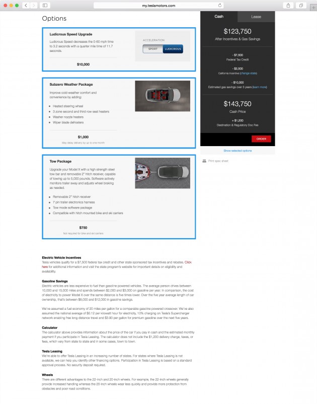 Direttamente dal configuratore on line, ecco le prime immagine della Suv elettrica della Tesla, la Model X. Il modello è talmente vicino alla messa su strada – inizio 2016 – che, nonostante non siano state rilasciate informazioni ufficiali alla stampa, i clienti possono già configurare la versione preferita scegliendo on line colori e optional. Certo, non tutti gli aspiranti clienti, ma quelli che hanno deciso di staccare un assegno da 4.000 euro a garanzia delle loro reali intenzioni. Ieri qualcuno fra gli entusiasti promessi acquirenti americani ha pubblicato sul forum Teslamotorsclub.com le immagini catturate sul configuratore. Che rivelano che il modello di serie della Model X è praticamente identico alla concept car presentata nel 2012. Confermati l’abitacolo a sette posti, le porte con apertura ad ala di gabbiano e le maniglie a filo con la carrozzeria. La versione Signature Series offerta ai primi acquirenti ha la trazione integrale realizzata grazie a due motori elettrici, uno anteriore da 259 CV e uno posteriore da ben 503. Le batterie da 90 kWh dovrebbero garantire 240 miglia (quasi 390 km) di autonomia. Prezzo? Negli Staes, 132.000 dollari, cui se ne possono sottrarre 10.000 fra incentivi federali e californiani. Ma cui se ne possono aggiungere altri 10.000 se si vuole l’opzione “Ludicrous Speed update“, che permette accelerazioni “assurde”: da 0 a 60 miglia orarie (96 km/h) in 3,2 secondi.