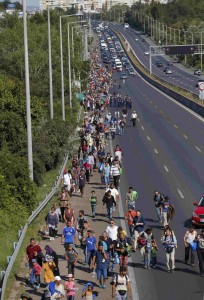 Migrants march along the highway for the border with Austria, out of Budapest, Hungary, September 4, 2015. Hundreds of migrants broke out of a Hungarian border camp on Friday and others set off on foot from Budapest as authorities scrambled to contain a migrant crisis that has brought Europe’s asylum system to breaking point. Hungary says it is enforcing European Union rules that it must register all migrants caught crossing Hungary’s borders, but thousands are refusing and demand they be allowed to continue their journey to western Europe from war and poverty in the Middle East, Africa and Asia. The European Union normally allows free movement between the 26 countries of its Schengen border-free zone, but its rules require asylum seekers to register in the first country where they arrive and remain until they are processed. REUTERS/Laszlo Balogh