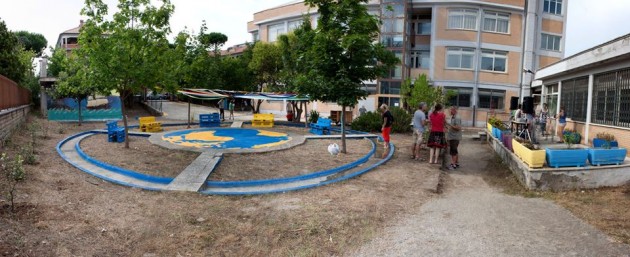 Poi il progetto di recupero è arrivato anche all’istituto “Pio La Torre” di Roma, dove sono stati investiti quasi cinquemila euro. Una scuola che si trova nel quartiere soprannominato “Bronx”, nella periferia nord ovest della capitale. Dal 6 al 13 luglio alunni, famiglie e insegnanti insieme a giovani architetti, scultori e pittori, falegnami e agricoltori hanno cambiato faccia alla scuola e all’area intorno. Tra i volontari anche lo street artist David Vecchiato, noto come Diavù, coordinatore del museo di urban art di Roma. Oltre a recuperare quello che c’era già, sono stati creati nuovi spazi: una mediateca, una sala cinema-teatro, un laboratorio multimediale, un bar dei piccoli, l’orto e il giardino, prima seppellito da erbacce alte. La “casa del viaggiatore”, così è stato chiamato il neonato percorso tra i muri scolastici. “Sono stati piantati 20 alberi da frutto e nell’orto zucchine, pomodori, insalata e peperoncino – aggiunge Paola -. Vorremmo che il bar distribuisse gratuitamente frutta e merende sane per i bimbi. Stiamo cercando cooperative e supermercati che aderiscano all’iniziativa. Mentre dvd e libri sono stati donati dalla cittadinanza dopo un appello su Facebook”.
