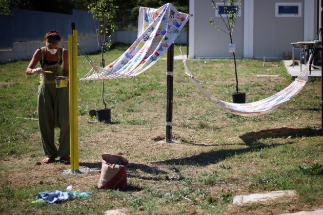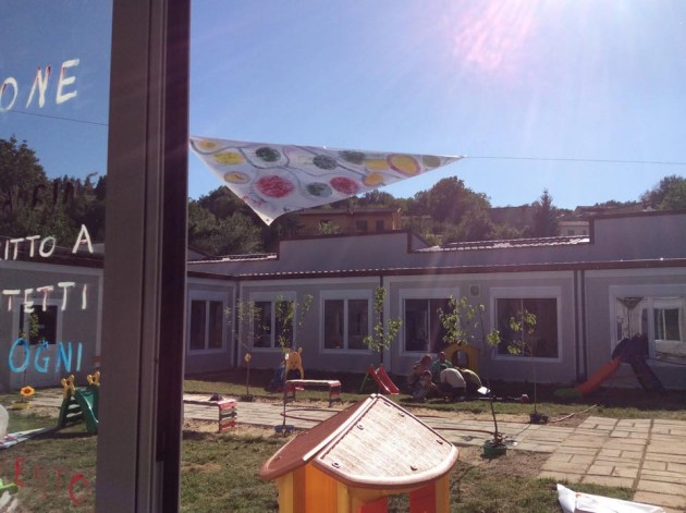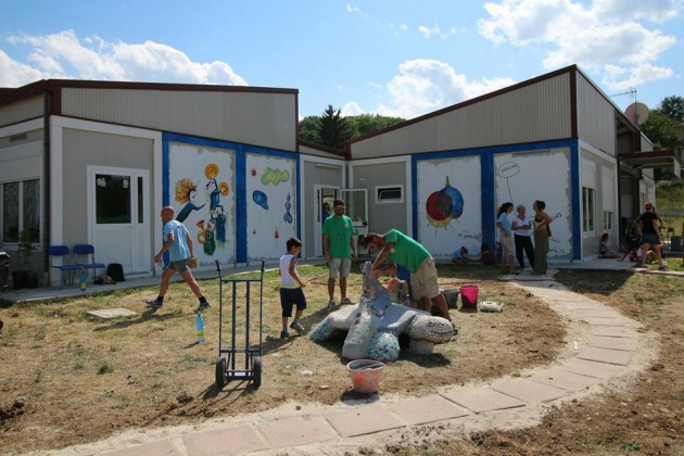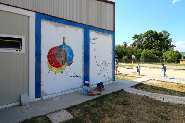 Ultima impresa: la “scuola-container” a Pagliare di Sassa, una frazione de L’Aquila dove vivono poco più di ottomila anime. “Non mi aspettavo che a distanza di sei anni dal terremoto ci fossero ancora dei bambini che vanno a scuola nei container”, commenta Paola. E così ci hanno pensato loro a rendere più accoglienti quei pezzi di prefabbricato. Il cantiere è durato dal 20 al 30 luglio. Costo: tremila euro. Il prato che circonda la scuola è stato trasformato in un parco urbano con alberi da frutto e abeti. Nella zona verde che separa i container sono spuntate panchine, amache e altalene.