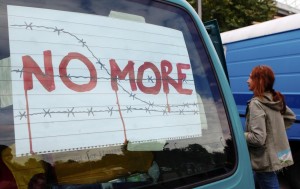 An activist walks past a car taking part in a convoy of around 140 vehicles leaving for Hungary from Vienna, September 6, 2015, to distribute aid to migrants and to collect refugees to bring back to Austria. People taking part run the risk of violating laws on human trafficking, police said, but officers were there at the meeting point outside a football stadium just to provide security and guide traffic. REUTERS/Heinz-Peter Bader