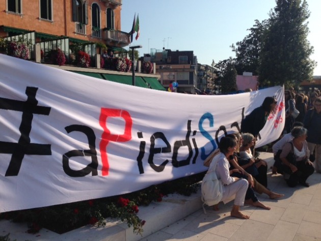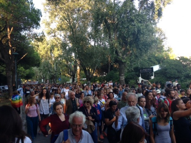 Venezia – Circa un migliaio i partecipanti, secondo la questura, probabilmente il doppio per gli organizzatori, di varie nazionalità e di tutte le età all’evento organizzato al Lido di Venezia. Il corteo, partito dal molo di Santa Elisabetta verso le 17, ha visto in testa tra gli altri il regista Andrea Segre, uno dei promotori, e all’interno c’è anche il segretario confederale della Cgil Susanna Camusso. Tra i partecipanti nelle prime file anche Staino, Silvia Costa e il parlamentare di Sel Giulio Marcon. “E’ importante dire che la marcia sta procedendo in 71 città – ha detto Segre -: anche se è stata promossa da personaggi dello spettacolo non è un’autocelebrazione, ma la richiesta di uscire dalla fortezza in cui ci siamo rinchiusi in Europa per fermare la tragedia dei morti”. Sullo striscione che apre il corteo c’è l’hashtag #apiediscalzi e tra i tanti cartelloni gli slogan ‘Non siamo un pericolo, siamo in pericolo’ e ‘Da Venezia a Kobane, da Budapest a Bruxelles’. A metà del tragitto è stato possibile anche immergere i piedi in tempere colorate, lasciando impronte sulla strada azzurre, arancioni, bianche e in altri colori pastello. Tra le musiche che accompagnano il corteo, ‘Vado al massim0’ di Vasco Rossi: “Dicono che questo sia il giorno di Vasco e allora ci facciamo accompagnare dalla sua musica”, ha detto Segre al megafono.