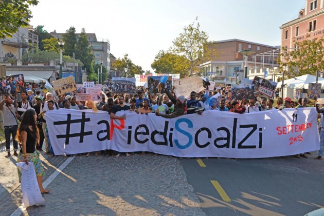 Una marcia di migliaia di persone “a piedi scalzi” dal tappeto rosso del Lido di Venezia, a Trento, fino a Napoli passando per Roma e per il festival della letteratura di Mantova. Sono state 71 le città che hanno accolto l’appello di intellettuali e artisti per sfilare senza scarpe in segno di solidarietà ai migranti in fuga dai loro Paesi. L’Italia è scesa nelle strade e nelle piazze in contemporanea in varie città italiane per dire no “ai muri della “Fortezza Europa” e chiedere la certezza di corridoi umanitari sicuri per vittime di guerre, catastrofi e dittature; accoglienza degna e rispettosa per tutti; chiusura e smantellamento di tutti i luoghi di concentrazione e detenzione dei migranti; la creazione di un vero sistema unico di asilo in Europa, superando il regolamento di Dublino.