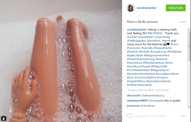 Socality Barbie gira il mondo, guarda la pioggia fuori dalla finestra, porta occhiali da vista e un cappello verde a tesa larga e, immancabilmente, si fotografa le gambe. Ogni foto ha decine di hashtag, frasi ispirate e migliaia di like: in meno di tre mesi dal suo esordio su Instagram ha già superato il milione di followers.