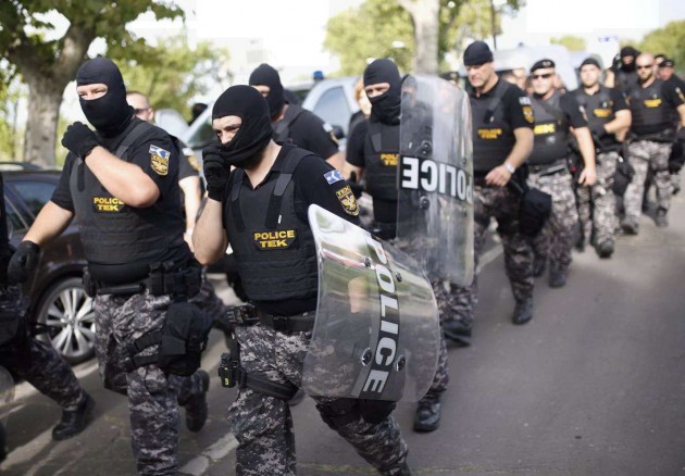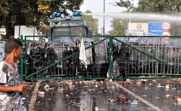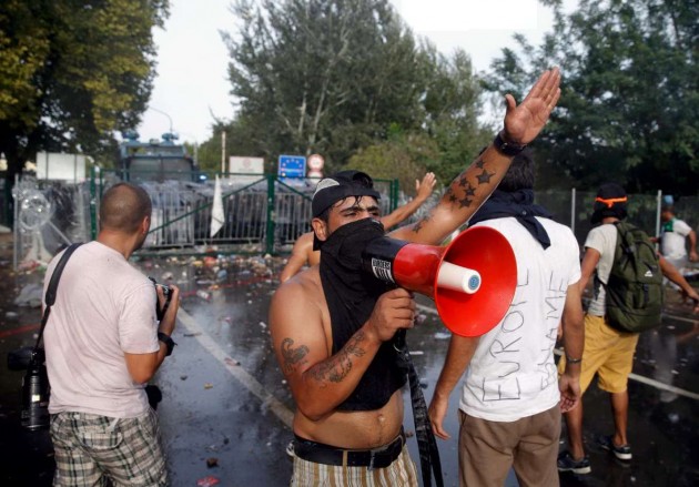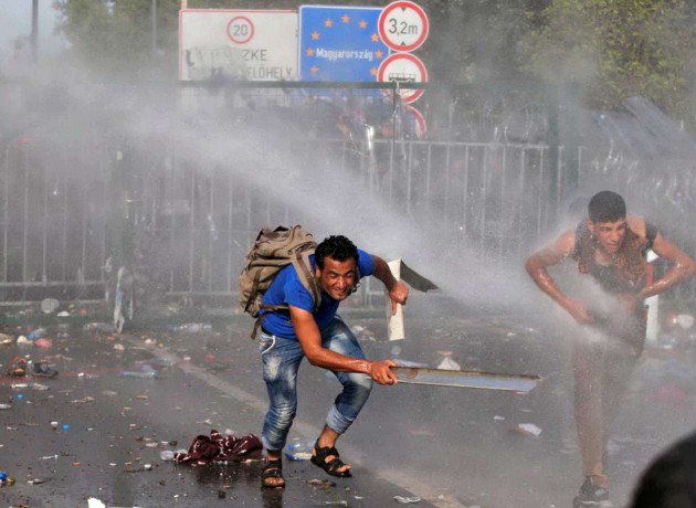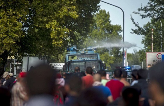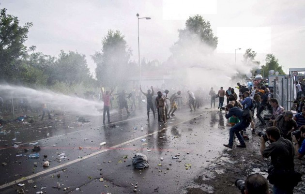 La tensione rimane particolarmente alta, con centinaia di profughi, soprattutto uomini, che urlano slogan anti europei e chiedono di poter passare la frontiera, lanciano scarpe e anche bottiglie d’acqua, pur essendo indispensabili visto il grande caldo. Per la seconda volta in meno di un’ora la polizia ha lanciato lacrimogeni e usato spray urticanti, provocando un fuggi fuggi generale, ed è intervenuta con i cannoni ad acqua.