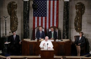 Pope Francis (C) addresses a joint meeting of the U.S. Congress as Vice President Joe Biden (L) and Speaker of the House John Boehner (R) look on in the House of Representatives Chamber on Capitol Hill in Washington September 24, 2015. REUTERS/Jim Bourg