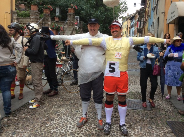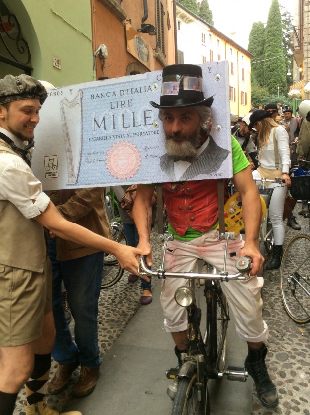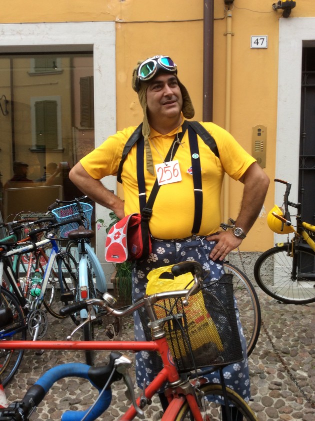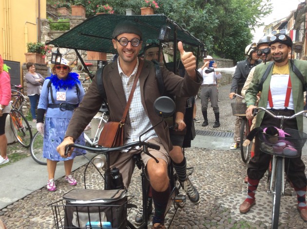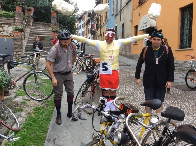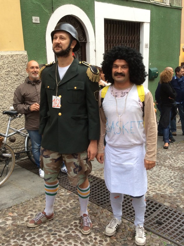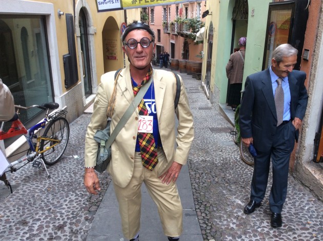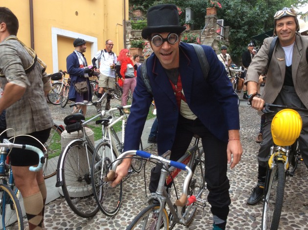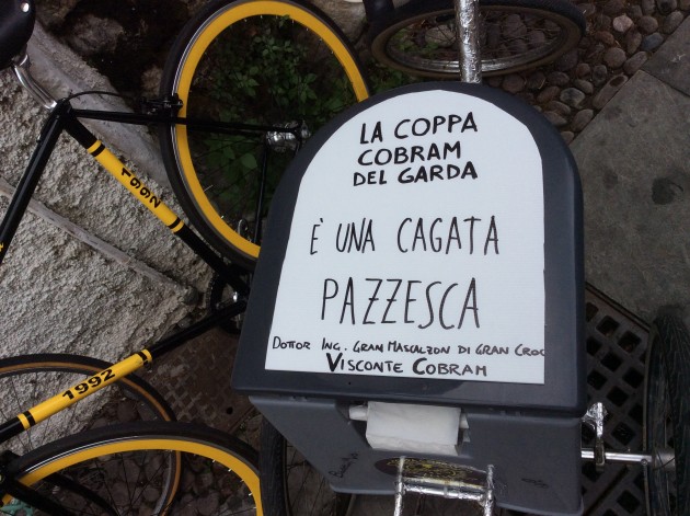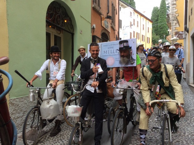 Il visconte Cobram era un fanatico di ciclismo, ma di Coppa ne aveva organizzata una sola. Il Biciclettaio matto (alias Mauro Bresciani, ideatore dell’evento) fa di più: raddoppia. E oggi, a Desenzano, dove un cielo coperto ed un accenno di pioggia non possono certo fermare un ‘evento‘ di tal portata – mette in scena la seconda edizione della mitica Coppa Cobram (#pedalilei è l’hashtag scelto). La rievocazione della terribile gara ciclistica di “Fantozzi contro tutti”, già un successo l’anno passato, quest’anno triplica i partecipanti: di bici vintage se ne contano 200 (contro i 70 della precedente edizione), con le iscrizioni chiuse con largo anticipo. Tanti mutandoni ascellari, occhialoni da aviatore, ma l’abbigliamento old style, sì consigliato, non è tuttavia d’obbligo. Molti i personaggi stravaganti, e con mise simpatiche seppur non in tema.