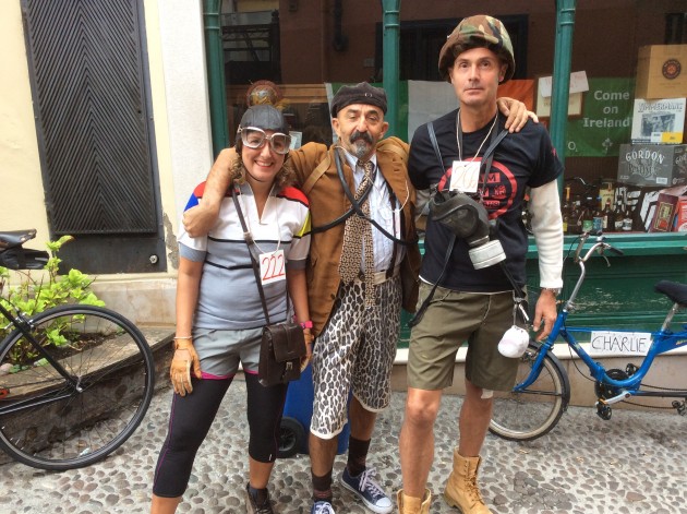 Quindi la distribuzione della ‘bomba‘ – l’intruglio grazie al quale Fantozzi vinse, si fa per dire, la gara – indispensabile per affrontare i 14 chilometri della seconda parte del tragitto, preludio al pranzo del ciclista. A tavola, però, non si va prima di aver superato una salita tragicamente denominata ‘Cima del Diavolo‘. Al termine del pranzo, di buzzo buono, ai blocchi di partenza per l’ultima tappa: gli ultimi, e pesantissimi perché percorsi a pancia piena, quattro chilometri. Lungo il percorso, veloce sosta ‘tecnica’ per quello che nel programma è indicato alla voce ‘saluto alla nonna’ (del Biciclettaio matto). L’omaggio al più creativo ed estroso corridore è una bici messa a disposizione dall’organizzatore: la District line, di ispirazione londinese, scatto fisso, telaio Ferrari Anni 80. Mica pizza e fichi.