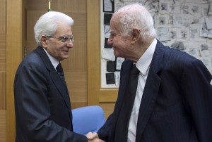 Roma – Il Presidente della Repubblica Sergio Mattarella con Alfredo Reichlin, al termine del convegno “Perchè la politica”, promosso in occasione dei 100 anni di Pietro Ingrao, oggi 31 marzo 2015.
