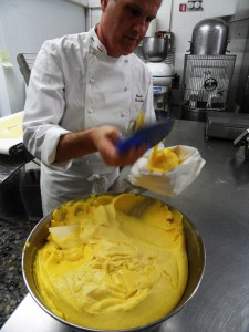 Sacchetti mette la crema nella sac à poche per farcire i cremini