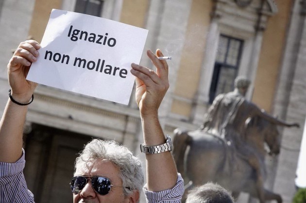 Per tutto il giorno in piazza del Campidoglio decine di persone hanno atteso la notizia delle dimissioni. Da una parte i contestatori che gridavano “Marino vattene a casa”. Dall’altra chi invitava a “resistere”. Con tanto di scontri verbali. In piazza, per urlare al sindaco di “andare a casa”, c’erano tutte le forze d’opposizione: da Ncd al M5s, da CasaPound alla lista Marchini, da Forza Italia alla Lega Nord. Tra gli altri Marco Pomarici, consigliere comunale di Noi con Salvini, ed ex presidente dell’Assemblea capitolina, ma anche l’ex vicesindaco della giunta Alemanno Sveva Belviso (Altra destra), fino al vicepresidente di Casapound Simone Di Stefano. Sotto il Campidoglio è arrivata anche una figura di cartone con l’immagine del sindaco di Roma e la scritta “Bye bye Marino #gameover”, una protesta organizzata dal Nuovo Centrodestra. “E’ stato – dicono gli alfaniani – il peggior sindaco della storia”.