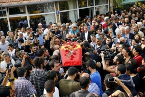 Family members and friends of Korkmaz Tedik, a victim of Saturday’s bomb blasts, carry his coffin during a funeral ceremony in Ankara, Turkey, October 11, 2015. Thousands of people, many chanting anti-government slogans, gathered in central Ankara on Sunday near the scene of bomb blasts which killed at least 95 people, mourning the victims of the most deadly attack of its kind on Turkish soil. REUTERS/Umit Bektas