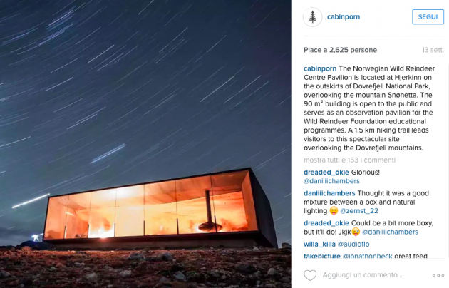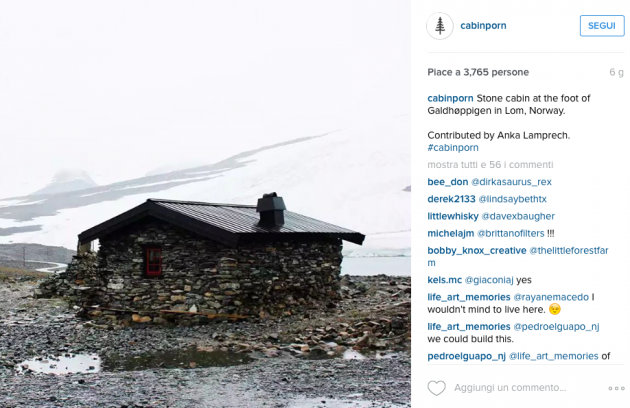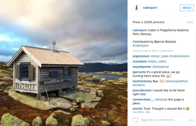 Le foto provengono da ogni parte del mondo, anche se a farla da padrone rimangono gli Stati Uniti. Tra i migliori e più suggestivi scatti ci sono gli antichi capanni in legno modello “trapper” del west americano, le casupole da pescatori del Nord Europa con tetto scuro e assi alle pareti chiare, ma anche baracche che richiamano il Medioevo dall’Europa dell’Est (cercate la Magic Cabin in Bosnia), o ancora le linee ipermoderne in angoli della California e del Nevada, o baite sull’acqua di un lago come la Boathouse sull’Obersee in Baviera. Non tantissimi gli scatti nel Belpaese, nonostante la presenza di luoghi isolati e suggestivi che rimangono tali anche dopo essere stati scoperti come i paesini più sperduti della Valle Maira, in Piemonte, dopo il film di Giorgio Diritti, Il vento fa il suo giro.