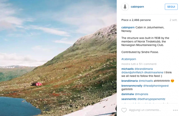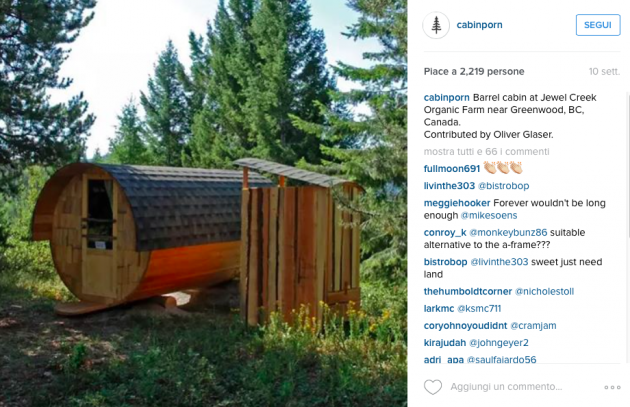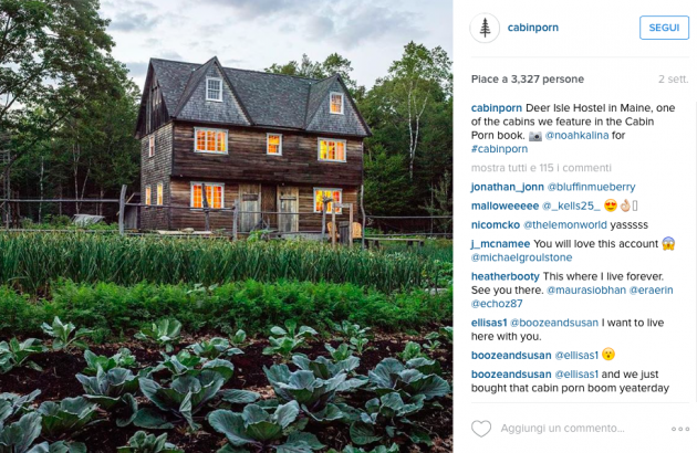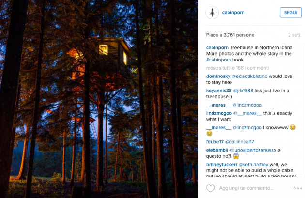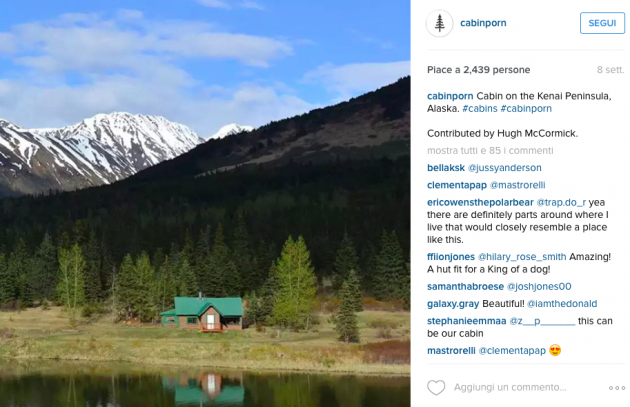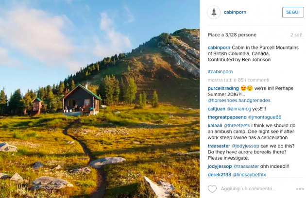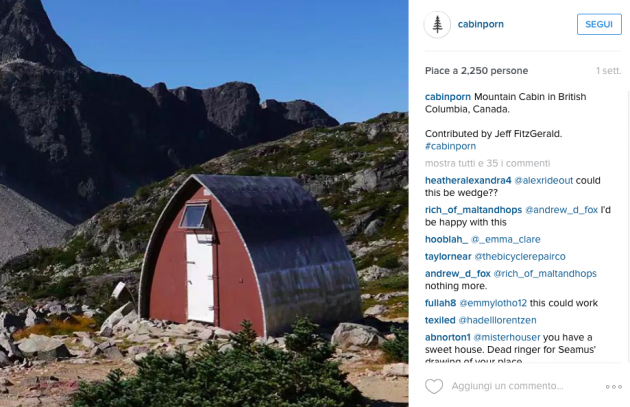 Sul sito di Cabin Porn appare una casetta di pietra sulle Alpi di Pianlino a Montesinaro in provincia di Biella, uno sgangherato cabinotto in legno vicino alla costa a pochi chilometri da Venezia, ma ci sono anche sontuosi esempi di baite in Val Brembana o in Valle Spluga, una casetta sull’albero nel parco Nazionale del Gran Paradiso e un rifugio in legno arroccato su una montagna nelle Alpi al confine tra Slovenia e Italia che si sta costruendo in questi mesi. Si tratta del Bivacco Luca Vuerich, una “cabin porn” che rende omaggio all’alpinista omonimo morto in una valanga nel 2010. Gli alpinisti potranno rifugiarsi lì gratuitamente, solo se riusciranno a scalare i 2531 metri della cima su cui è costruito.