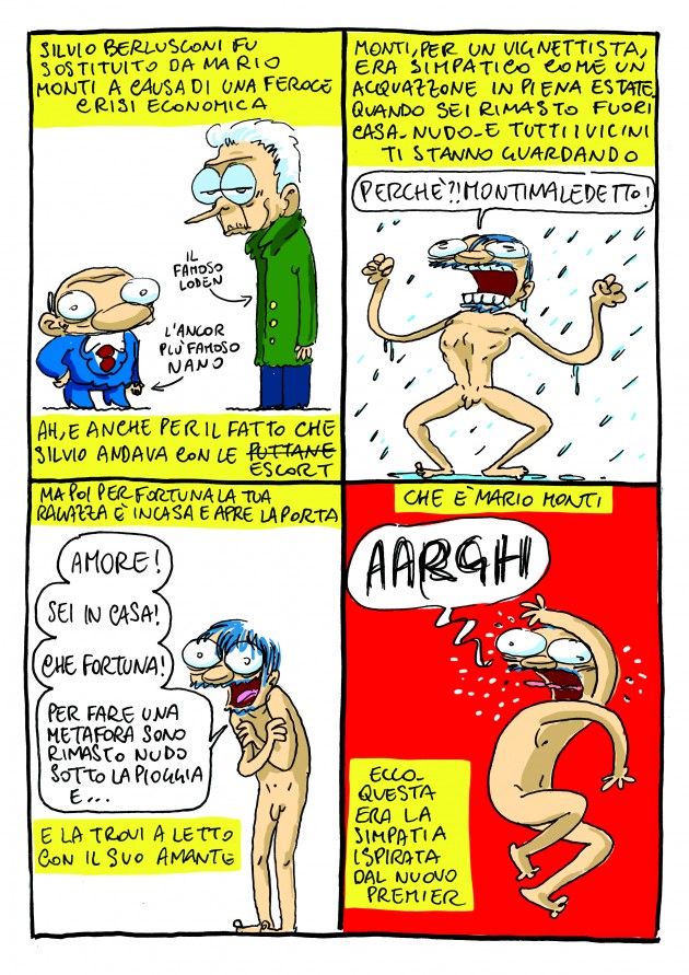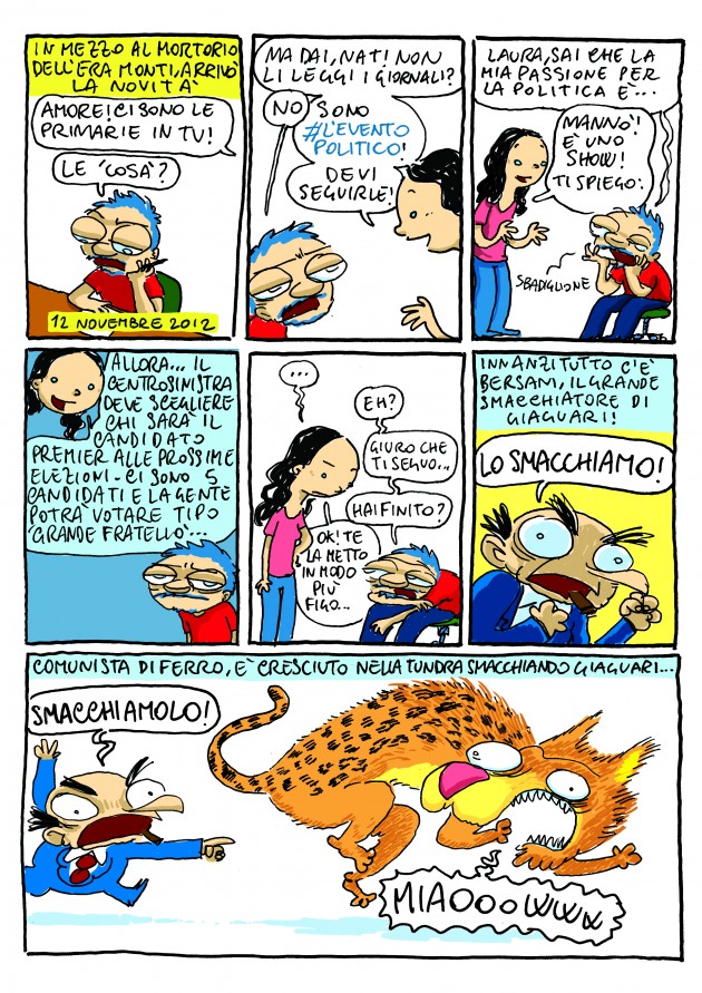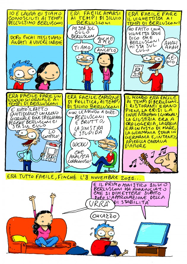 Natangelo non cerca aforismi senza tempo, epigrammi cinici, come si limitano a fare tanti suoi colleghi, ripetendo per decenni uno schema sempre uguale. In fondo Mario è un giornalista con tanto di tesserino che si esprime per vignette, fa (anche) informazione, non solo comicità e satira. Ma è anche un narratore che sta trovando il passo del racconto lungo. Nei reportage che realizza per il Fatto – dal meeting di Comunione e liberazione al confine dell’Ungheria nella crisi dei migranti – ai libri. Anche in un lavoro precedente, su Giorgio Napolitano, Natangelo aveva messo al centro la politica. Ma in “Pensavo fosse amore..” è ancora più chiaro il suo approccio e molto più matura la padronanza dei meccanismi narrativi. Per parafrasare Giorgio Gaber, a Natangelo non interessa la politica “in sé”, ma “la politica in me”.