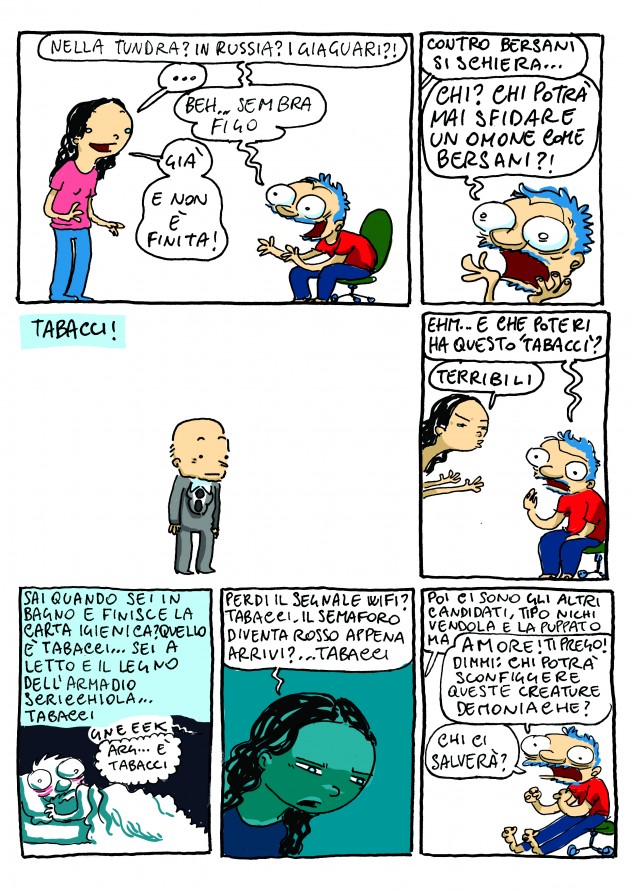In anni che non sono più di individualismo ma semplicemente di solitudine, neppure la tv è rimasta a creare il sostrato di un’identità popolare diffusa, a darci un argomento di conversazione al mattino. Il web spinge a creare confortevoli nicchie di isolamento. Non ci restano che il calcio e la politica, come terreno condiviso. Anche Zerocalcare e Gipi, i due giganti del fumetto italiano che con ironia Natangelo evoca nel suo libro (“pensavo che Zerocalcare fosse il tuo pseudonimo”, dice il Renzi nella testa di Nat), hanno cercato di costruire un legame con i propri lettori basato sulla ricerca di qualcosa di sentito da tutti, o almeno da molti, un’ancora a cui appendere la narrazione. Gipi creando una provincia astratta, nessun luogo e dunque tutti i luoghi, anonima come quasi tutta l’Italia di città. Zerocalcare usa una leva più generazionale, i lettori entrano in sintonia perché hanno le stesse esperienze di consumo: il Game Boy, le merendine, le serie tv scaricate da Torrent.