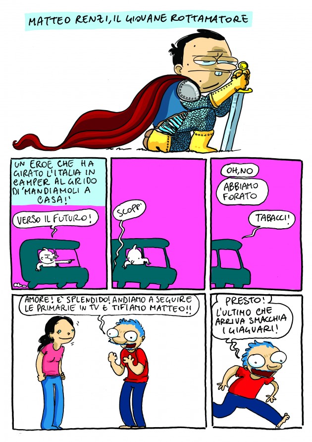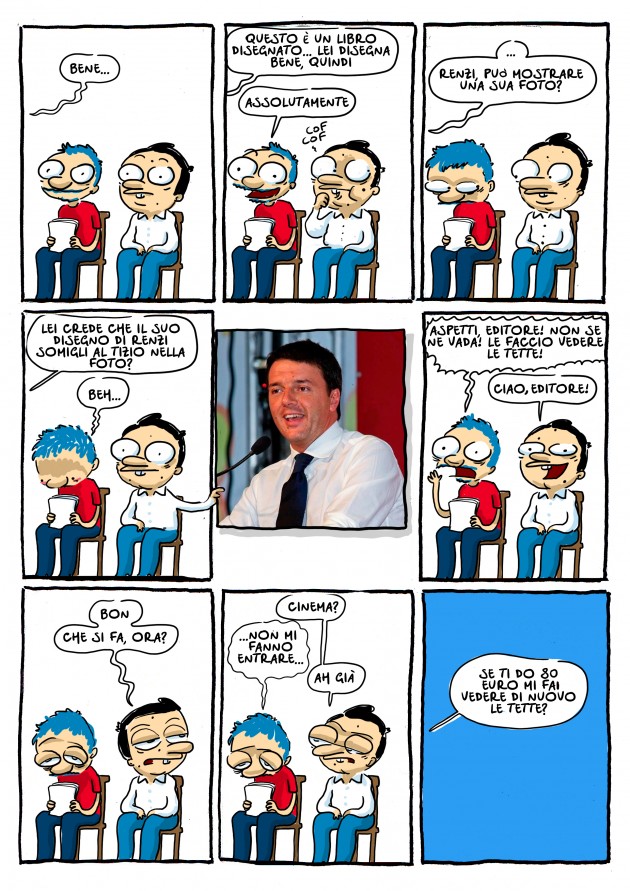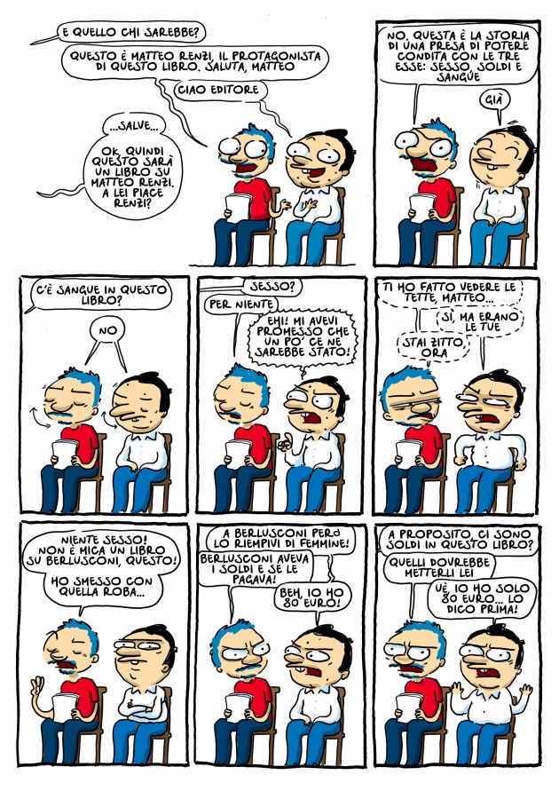 Natangelo è così bravo perché dei personaggi delle sue vignette non si libera mai, anche quando posa il pennarello e spegne il pc, continuano a perseguitarlo, di solito solo nella sua testa. L’unico modo che ha per affrontare Renzi (e, prima di lui, Giorgio Napolitano) è entrare nelle sue stesse vignette e affrontarlo. Il risultato di questo corpo a corpo è “Pensavo fosse amore invece era Matteo Renzi”, il volume che Natangelo pubblica per Magic Press. Non una raccolta di vignette, ma di una seduta di autocoscienza politica, il tentativo di dare un senso alla mediocrità delle avventure del Palazzo, senza esserne travolto (una fidanzata renziana complica tutto) e di farsene beffa. Seriamente, però.