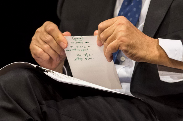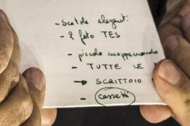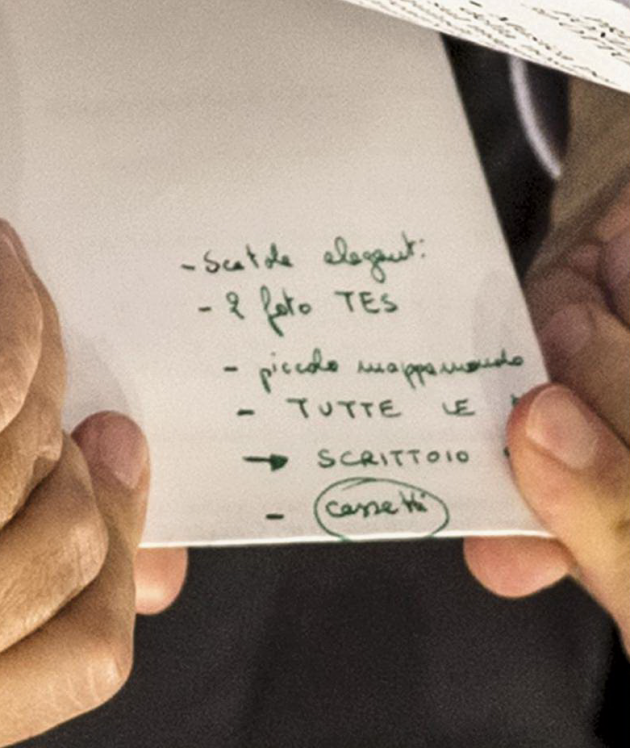“Scatole eleganti”, “2 fototessere (?)”, “piccolo mappamondo“, “tutte le (?)”, “scrittoio” e “cassetti“. E’ questo l’elenco di cose segnato su un foglietto che Ignazio Marino, sindaco di Roma non più dimissionario, stringeva tra le mani venerdì mattina durante la presentazione del nuovo consiglio d’amministrazione dell’Auditorium della capitale. Forse una lista di cose da portar via dal Campidoglio?