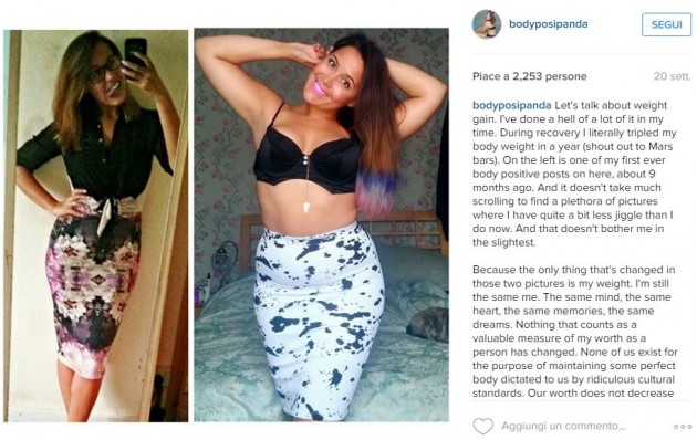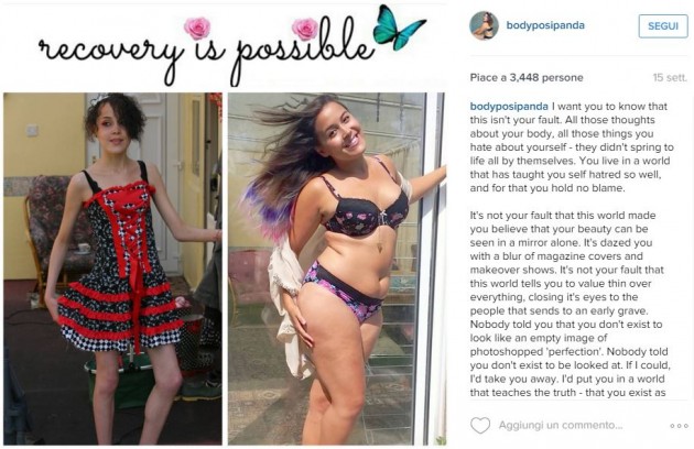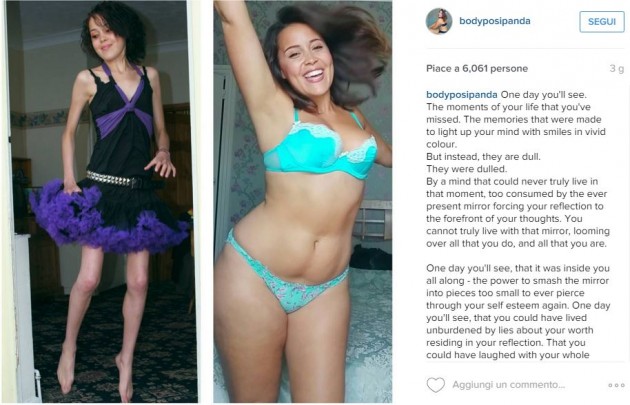 Le è stata diagnosticata l’anoressia all’età di 14 anni e ha lottato con tutte le sue forze per uscire dalla malattia. E’ arrivata a pesare meno di trenta chili e i medici le avevano dato poche settimane di vita. Megan Jayne oggi ha deciso di aprire un profilo su Instagram chiamato “Body Posi Panda” dove attraverso la sua nuova fisicità cerca di comunicare alle ragazze che la seguono quanto sia importante volersi bene.