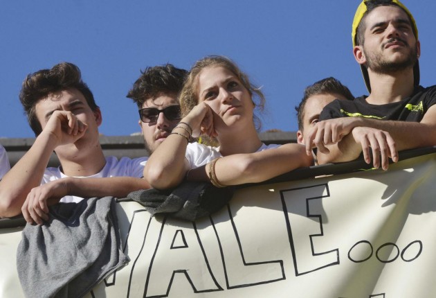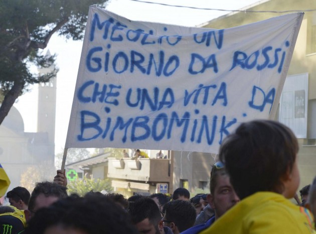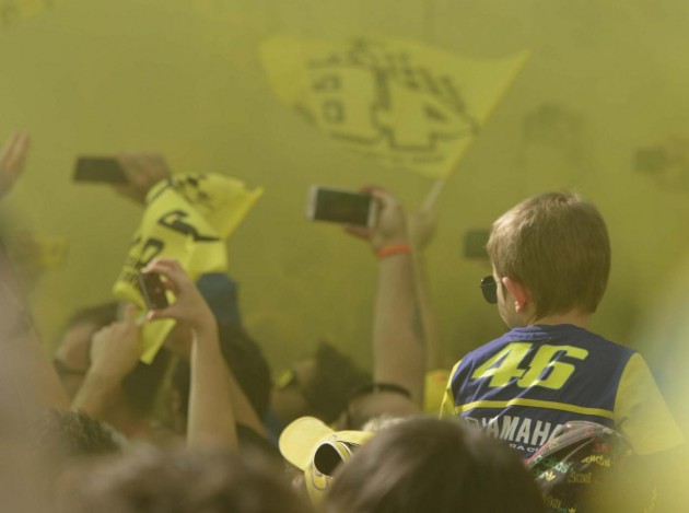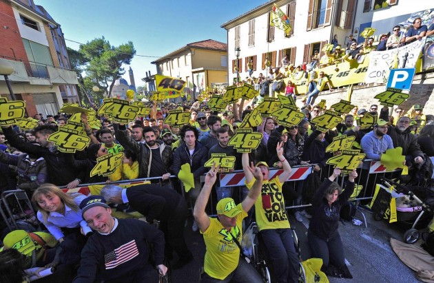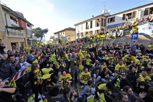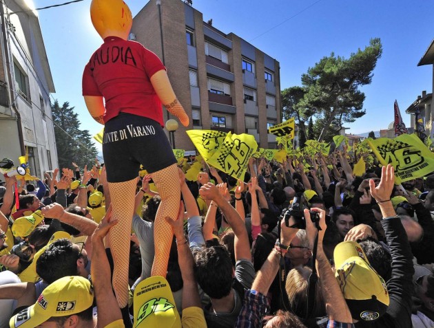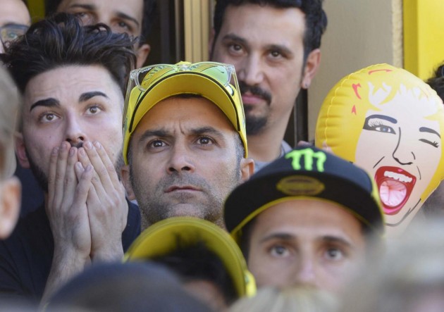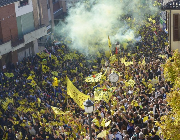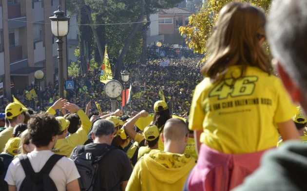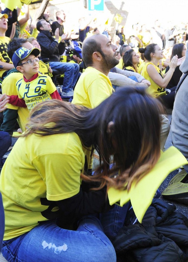 Una folla rumorosa tutta tinta di giallo: 30mila tifosi riuniti in una piazza di un paesino di 8mila abitanti. E’ stata la domenica diversa di Tavullia, il paese d’origine di Valentino Rossi. Tutti con la maglietta “#iostoconvale” e tutti davanti al maxischermo per sostenere il Dottore nella rimonta sfiorata al Gp di Valencia. Sorrisi e speranze prima della gara e tanta delusione e rabbia dopo per il presunto “Biscottone” alla spagnola: l’accordo tra i piloti spagnoli per favorire Jorge Lorenzo. Tra le tante persone c’era anche il sindaco di Pesaro, Matteo Ricci che ha fine gara ha esaltato il Dottore: “”Valentino ha vinto il titolo di campione dello sport, contro uno sport che non vogliamo sia dimostrato da Marquez. Il mondiale vinto da Lorenzo non lo ricorderà nessuno, festeggia da solo, nemmeno gli spagnoli esultano per lui e per Marquez. Merita l’applauso di tutti per il carattere e la forza dimostrata anche oggi. Bravo Vale, hai ancora tanto da dare”.