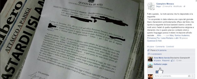 Su Facebook è comparsa anche quella di Giampiero Monaca, che ha postato copia della querela: “Ho acquistato in data odierna una copia del giornale Libero ritenendomi profondamente offeso dal titolo che riporta la seguente dicitura, ‘Bastardi islamici'”, scrive online. Monaca aggiunge di avere “molti amici fedeli di quella rispettabilissima religione” e ritiene “che in questo preciso contesto storico questo linguaggio possa rivelarsi incitazione all’odio razziale e religioso“. In serata il presidente dell’Ordine dei giornalisti della Lombardia, Gabriele Dossena, ha segnalato il titolo al Consiglio di disciplina territoriale perché faccia una approfondita valutazione del caso e per verificare se ci siano state o no violazioni delle Carte deontologiche della professione giornalistica.