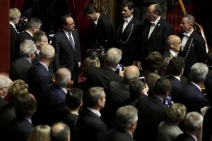 French President Francois Hollande (top C) arrives at a special congress of the joint upper and lower houses of parliament (National Assembly and Senate) at the Palace of Versailles, near Paris, France, November 16, 2015, following the series of deadly attacks on Friday in the French capital. French President Francois Hollande said on Monday France was at war against cowards, and not in a clash of civilisations, after militant attacks killed at least 129 people in and around Paris last week. REUTERS/Philippe Wojazer