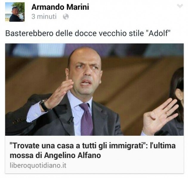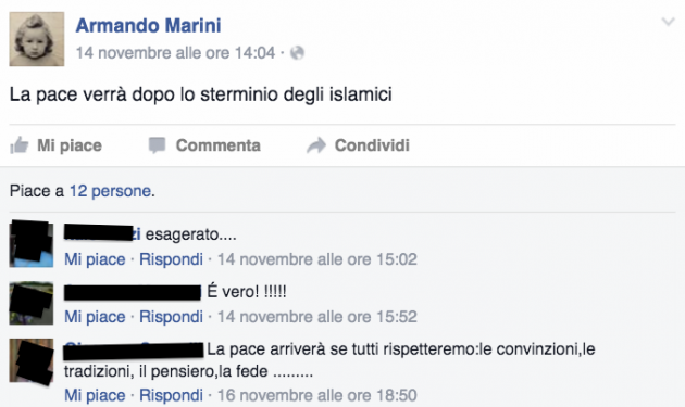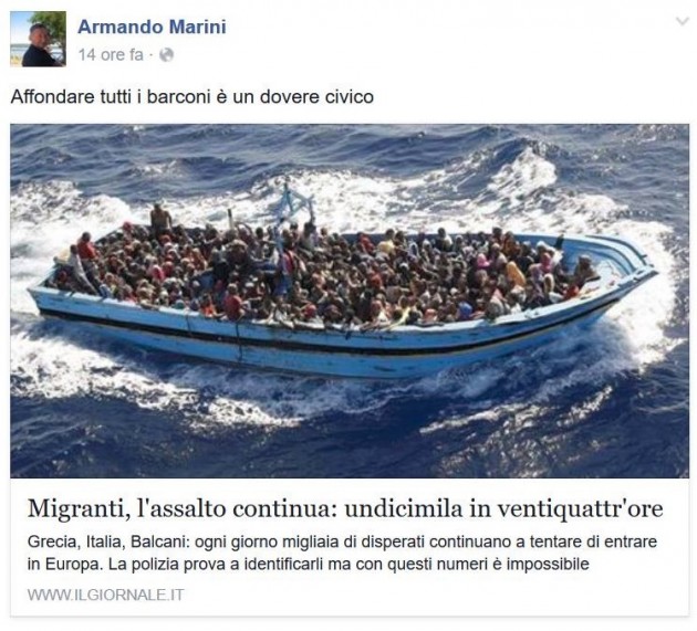 “Non esiste distinzione sono tutti da eliminare”, scrive Armando Marini il 15 novembre in risposta all’invito del presidente della Commissione europea Jean-Claude Juncker a “non confondere i terroristi con i rifugiati”. E poi, ancora: “Affondare tutti i barconi è un dovere civico”, “Dobbiamo bombardare il territorio dell’Isis con almeno 10 bombe atomiche almeno siamo sicuri che non esisteranno più”.