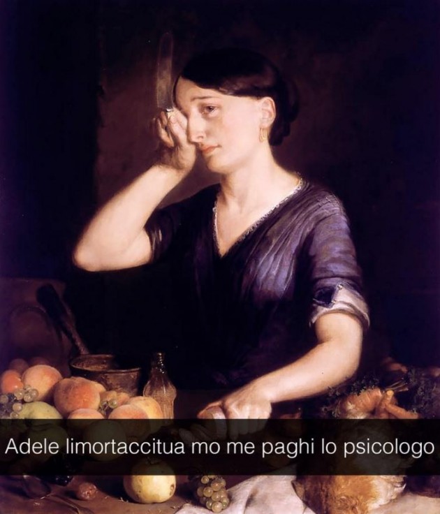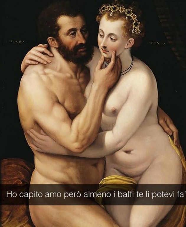 Negli abbinamenti di Guerrera c’è l’incontro di due mondi che nessuno, prima di lui, aveva mai immaginato di mettere insieme. Quadri realizzati secoli fa con espressioni gergali che dominano il modo di parlare di tutti noi socialmaniaci. Ma non c’è solo spazio per le disavventure comiche di questo mondo 2.0 fatto di social e whatsapp. Anzi, nelle “opere” di Guerrera la fa da padrone l’amore. O la mancanza dell’amore. Che in fondo è la stessa cosa. Il giovane pugliese ha uno sguardo ferocemente cinico sui sentimenti, persino sul sesso. Un disincanto molto contemporaneo che magari non ci farà credere troppo nei sentimenti profondi o nelle storie infinite, ma che sicuramente ci fa fare tante risate.