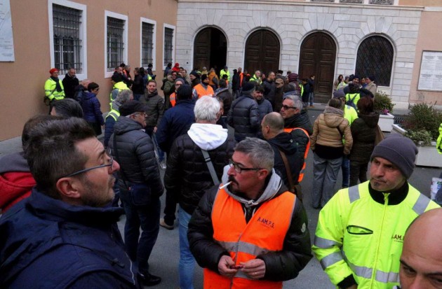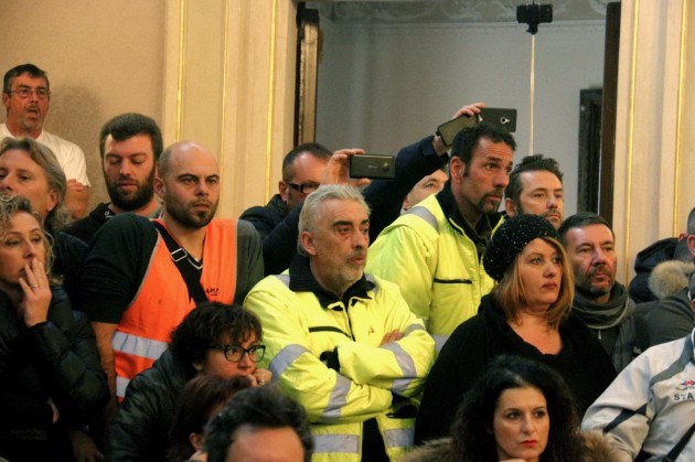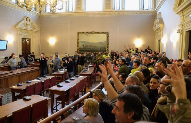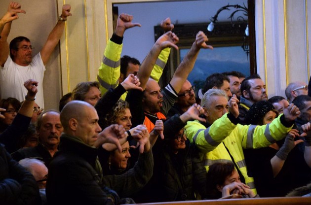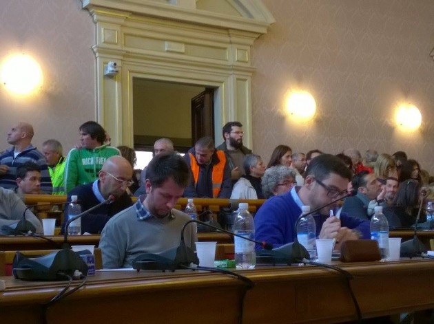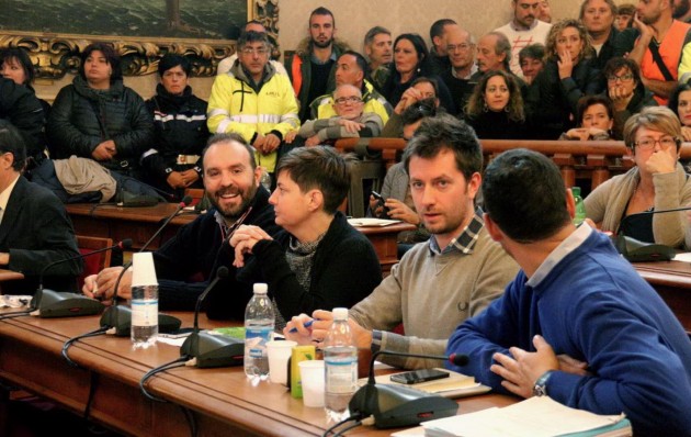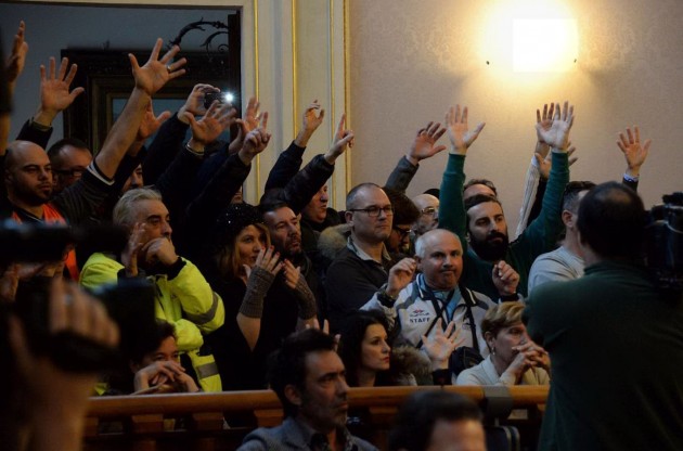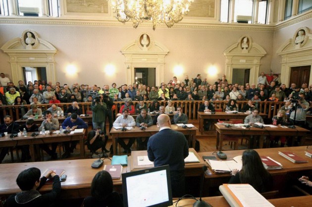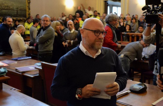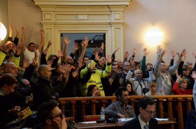 300 operai in Aula: “Paura di perdere il lavoro” – L’immagine plastica dell’intersezione tra queste due partite in contemporanea (Comune-lavoratori e giunta-opposizioni) sono circa 300 lavoratori che si sono presentati dal primo mattino all’interno della sala consiliare di Palazzo Civico, una rappresentanza dei 500 coinvolti tra azienda e indotto. Anche per questo è diventata una seduta-fiume, difficile, piena di interruzioni. La voce della presidente dell’assemblea, Giovanna Cepparello, eletta con Buongiorno Livorno (lista di “sinistra-sinistra”), fa fatica a superare in certi momenti le proteste dei lavoratori e a far parlare consiglieri, sindaco, assessori. In particolare il confronto serrato è con l’assessore al Bilancio Gianni Lemmetti, portabandiera dell’operazione concordato. Per l’intero consiglio tutta la giunta resta intorno a Nogarin. Manca solo l’assessore all’Ambiente, Giovanni Gordiani, che arriverà solo a tardo pomeriggio: meno di un mese fa aveva minacciato dimissioni, poi il sindaco lo aveva convinto a rimanere. Gordiani è anche l’unico che in giunta ha votato contro all’approdo in tribunale della crisi di Aamps. La presidente Cepparello chiede alla platea degli operai di non applaudire e non fischiare e loro lo fanno: per applaudire un intervento che li convince muovono le mani in aria, come facevano qualche tempo fa gli indignados, e per fischiare alzano il pollice verso.