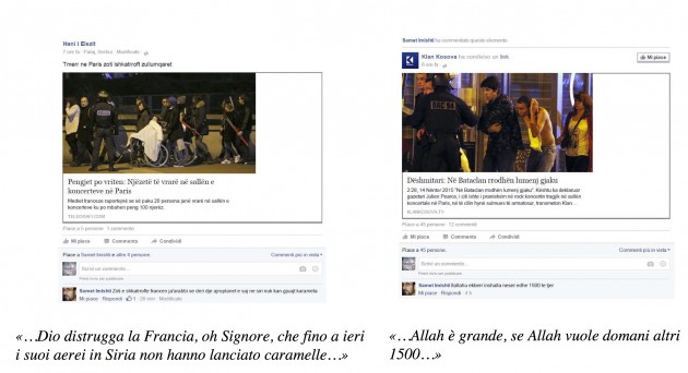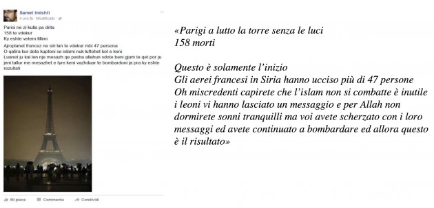 “Parigi a lutto, la torre senza luci. 158 morti. Questo è solamente l’inizio (…). Voi avete continuato a bombardare e allora questo è il risultato”. È questo il tenore dei messaggi su Facebook condivisi da Samet Imishti, il kosovaro arrestato dalla Digos di Brescia e dai reparti speciali della Direzione nazionale antiterrorismo della Kosovo Police con l’accusa di terrorismo. Imishti, che prima di tornare in Kosovo faceva base a Chiari, nel bresciano, era molto attivo su Facebook sul gruppo “Me ose, pa ty – Hilafeti eshte rikthy!” (“Con te o senza di te il califfato è ritornato!”), destinato a balcanici residenti in Italia e utilizzato per un’attività di propaganda riconducibile a Daesh. Nell’abitazione di Imishti, in provincia di Brescia, è stato rintracciato il fratello Ismail, raggiunto da un provvedimento di espulsione dirmato dal Ministro dell’Interno Angelino Alfano per motivi di terrorismo.