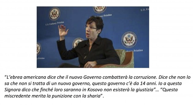 Alcuni messaggi erano diretti contro l’ambasciatrice Usa in Kosovo, Tracey Ann Jacobson: “L’ebrea americana dice che il nuovo governo combatterà la corruzione (…) questa miscredente merita la punizione con la Sharia”. Nel corso delle perquisizioni sono state trovate armi ed elementi che collegano gli indagati al “noto terrorista kosovaro del Daesh, Lavdrim Muhaxheri”.