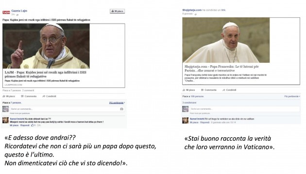 Tra i post di Samet Imishti sono state trovate anche minacce contro il Papa: “E adesso dove andrai? Ricordatevi che non ci sarà più un Papa dopo questo, questo è l’ultimo. Non dimenticatevi ciò che vi sto dicendo!”. Altri utenti facevano riferimento all’Europa e alla Francia: “L’Europa verrà disgregata, mentre entro cinque anni si formeranno gli stati islamici e ci sarà una legge, quella della Sharia”; “Dio distrugga la Francia, oh Signore, che fino a ieri i suoi aerei in Siria non hanno lanciato caramelle”.