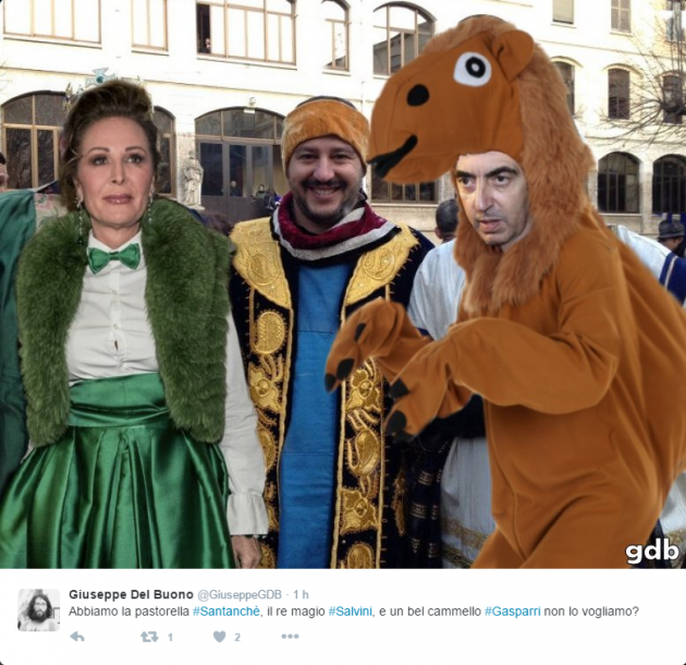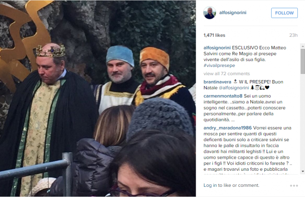 La foto di Salvini in versione natalizia con fascia arancione e abito nero e oro, è comparsa sul suo profilo Twitter, dove il segretario della Lega, tenace sostenitore delle tradizioni natalizie, ha scritto: “Evviva i Re Magi, evviva il Presepe, evviva i bimbi in festa!“. La foto è stata poi ripresa dal direttore di Chi, Alfonso Signorini, che l’ha lanciata su Instagram scrivendo: “Esclusivo. Ecco Matteo Salvini come Re Magio al presepe vivente dell’asilo di sua figlia”.
