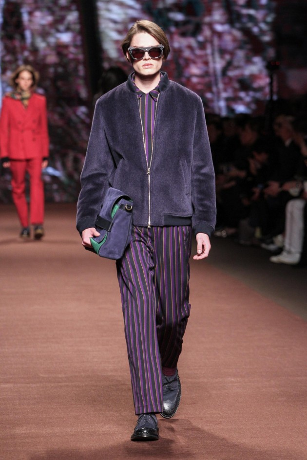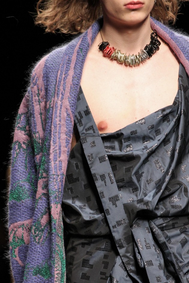 A riportarci alla sobrietà è Giorgio Armani che ha portato in passerella uno stile senza stravaganze con una collezione dove spicca il grigio, da quello perla all’acciaio, Non si può dire lo stesso per Etro che ci propone un’immagine maschile con cappotti animalier e pantaloni fucsia. L’animalier è il marchio di fabbrica anche di Roberto Cavalli, che sostituisce le camicie con dei dolcevita e propone uno stile rock anni 60 con l’uomo in pelliccia. Vivienne Westwood non usa mezzi termini: l’armadio è unisex e l’uomo sfila direttamente con tuniche e abiti drappeggiati rubati dall’armadio di un’ipotetica lei. Ci mancava l’ispirazione alla pop art per l’uomo di Moschino dove i colori brillanti e una silhouette che sembra disegnata a matita caratterizza la collezione in passerella.