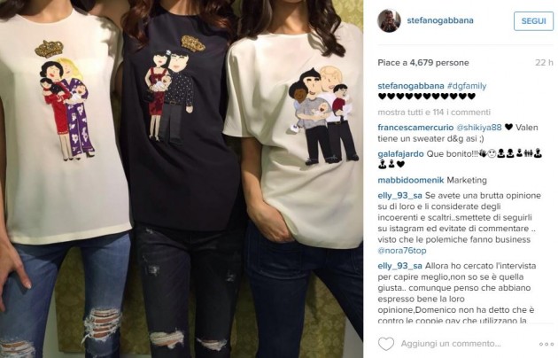 E la foto di Stefano Gabbana (che in realtà è il più progressista dei due), non poteva che riaccendere gli animi, con centinaia di commenti che chiedevano spiegazioni su quella che per molti è una giravolta sul tema. Gabbana, da sempre attivissimi sui social, ha risposto alle critiche con un certo talento acrobatico: “La famiglia è tradizionale da qualsiasi persona essa sia formata. Mi spiace che molta gente interpreti male questo messaggio, io voglio solo dire che Famiglia è amore e che l’amore non è sessualità”. Un salto mortale carpiato per affermare, se si legge bene tra le righe, che lui la pensa diversamente dal suo socio in affari ed ex compagno Domenico Dolce: “Lei ha letto l’intervista? Non ha letto bene chi dice cosa”, risponde a un altro commentatore critico.