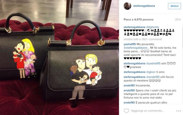 Nella giornata di giovedì, Stefano Gabbana ha pubblicato su Instagram la foto di una borsa griffata D&G con una famiglia in gay in bella mostra: due papà e tre bambini. Giornate di family day e unioni civili, di famiglie “tradizionali” e famiglie arcobaleno, di polemiche infinite tra chi è favorevole e chi è contrario. Quale occasione migliore, dunque, per Dolce & Gabbana per rientrare nel dibattito che qualche mese fa li aveva visti tristemente al centro del dibattito pubblico sul tema?