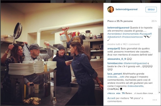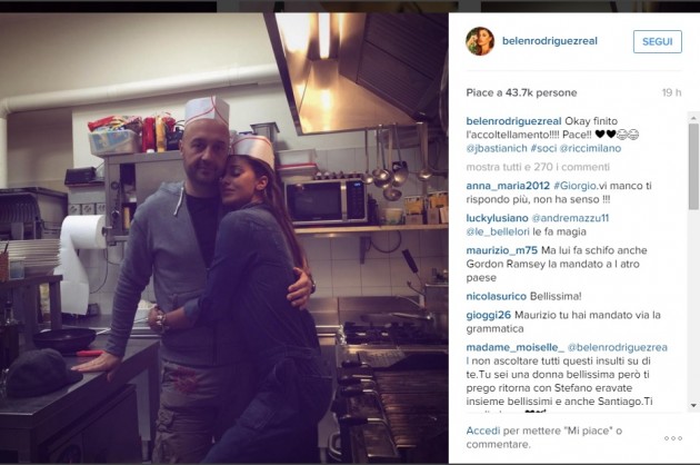 A smorzare la polemica, almeno ufficialmente, sono arrivati due scatti pubblicati sul profilo Instagram di Belen: nel primo, lei e Bastianich simulano un duello a colpi di coltelli e pentolame vario nella cucina del Ricci; nel secondo, i due sono stretti in un abbraccio riparatore. E, come sempre, la Rodriguez non usa francesismi: “Questa è la risposta all’ennesima cazzata di gossip…”. Tutto finito? Conoscendo il soggetto in questione, solo per il momento…