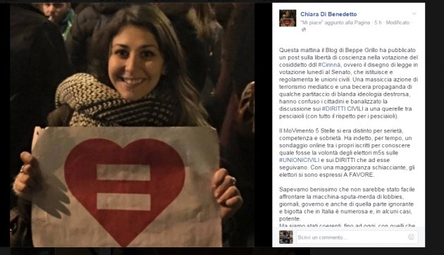 Tra i più critici, la deputata Chiara Di Benedetto: “Siamo stati coerenti, fino ad oggi”, ha scritto in un lungo post su Facebook, “con quelli che abbiamo sempre creduto fossero i principi del M5s, cioè diritti per tutti, nessuno deve rimanere indietro. Il M5s è caduto come un allocco. Ci siamo lasciati invischiare dalla melma puzzolente e ignorante. Ci siamo lasciati sviare dalla nostra operazione che doveva essere di tutela dei diritti di tutti. Abbiamo illuso e offeso le persone“. Secondo Di Benedetto, l’annuncio di Beppe Grillo sarebbe stato una scelta sbagliata simile a quella di altri partiti: “La libertà di coscienza sul ddl Cirinnà, a due giorni dal voto, suona come un patetico tentativo di galleggiare, di non dispiacere a nessuno, di compiacere tutti e di non spingersi troppo oltre, verso quella famosa rivoluzione culturale che, oramai, sono solo parole vuote e offese. Mi sento offesa in prima persona. Mi vergogno anche un po’ di aver tradito chi credeva che alle nostre parole seguissero i fatti. Le Unioni civili non sono un tema etico e chi lo sostiene è ignorante e in malafede”.