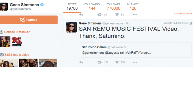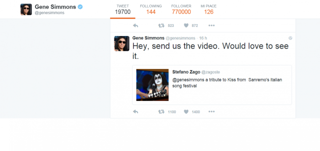 Trasformatisi nei Kiss per la performance dell’ultima serata, gli Elii hanno ricalcato l’originale tanto fedelmente da richiamare l’attenzione di Gene Simmons, storico frontman della band hard rock che infiammava le scene negli anni ’70 e ’80 e che, chiamato in causa da numerosi tweet che gli segnalavano la presenza del suo clone in salsa italiana sul palco dell’Ariston, non ha perso tempo e ha subito chiesto di avere il link del video per poter vedere l’omaggio. Esaudito non da un fan qualsiasi ma da Saturnino, l’artista ha dimostrato di aver gradito lo show, retwittando e ringraziando.