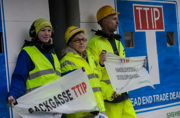 A Bruxelles per bloccare il Trattato di libero scambio transatlantico (Ttip). La mattina del 22 febbraio trenta attivisti di Greenpeace provenienti da 7 Paesi, hanno bloccato l’accesso al centro conferenze di Bruxelles dove fino al prossimo 27 febbraio è previsto il dodicesimo round di trattative a porte chiuse tra Stati Uniti e Unione europea sul Partenariato transatlantico su commercio e investimenti. Gli attivisti si sono incatenati all’ingresso del palazzo in cui si terranno le negoziazioni, mentre alcuni climber hanno aperto sulla facciata dell’edificio un grande banner che raffigura l’accordo di libero scambio tra Ue e Usa come una strada senza uscita, un vicolo cieco per l’Europa. Per la prima volta i negoziatori al tavolo discuteranno del controverso sistema alternativo di risoluzione delle dispute proposto dalla Commissione Ue, ovvero una sorta di Corte di arbitrato ad hoc, per la protezione degli investimenti.