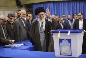 (160226) — TEHRAN, Feb. 26, 2016 (Xinhua) — Iranian Supreme Leader Ayatollah Ali Khamenei (Front) waves before casting his ballot in Tehran, Iran, on Feb. 26, 2016. Elections for Iran’s parliament (Majlis) and Assembly of Experts kicked off at 8 a.m. local time (0430 GMT) on Friday. (Xinhua/Iran Supreme Leader Office)