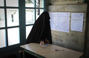 (160226) — TEHRAN, Feb. 26, 2016 (Xinhua) — A voter fills in her ballot at a polling station in the city of Qom, Iran, on Feb. 26, 2016. Elections for Iran’s parliament (Majlis) and Assembly of Experts kicked off at 8 a.m. local time (0430 GMT) on Friday. (Xinhua/Ahmad Halabisaz)